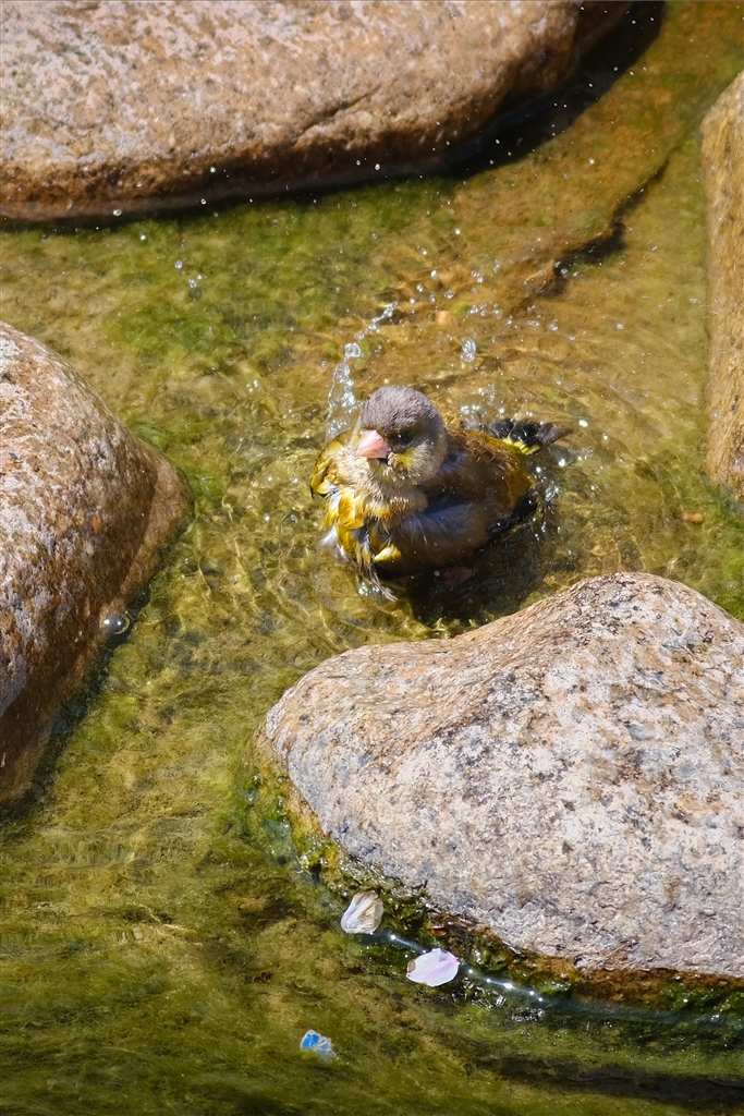 カワラヒワ♀の水浴びを盗撮