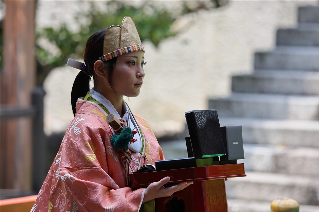 袿袴姿の采女が献上された腕時計(新製品)を奉納する