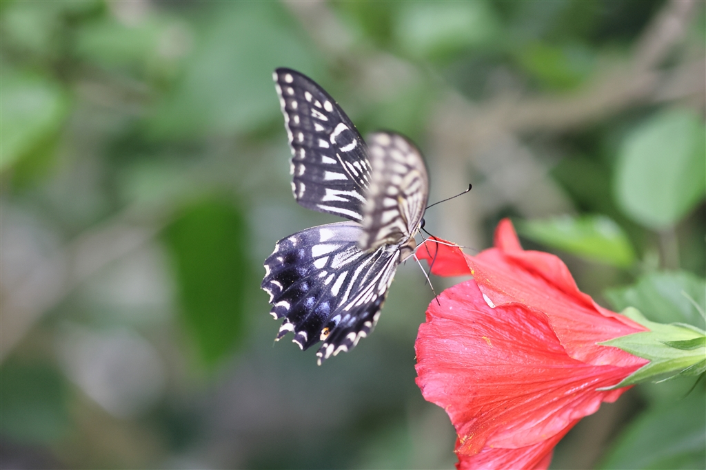 ハイビスカスに止まる寸前のアゲハチョウ