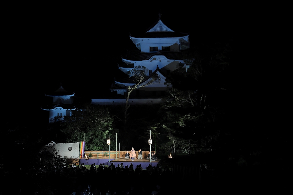 伊賀上野城の天守の前で薪能を演じる