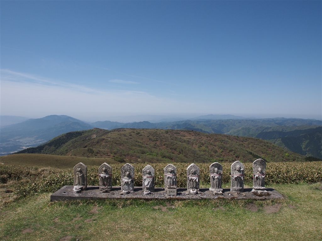 九体の石仏と山の風景。