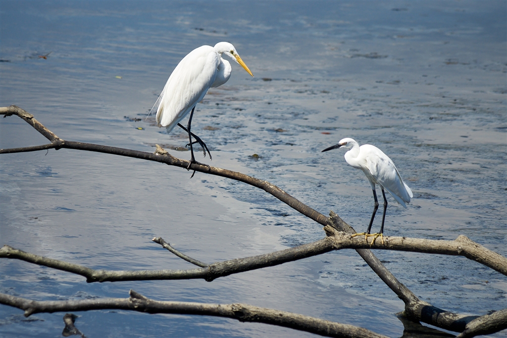 ダイサギ?とコサギ ダイサギは夏は嘴=黒 目先=緑色に変わる・・筈だが??!!