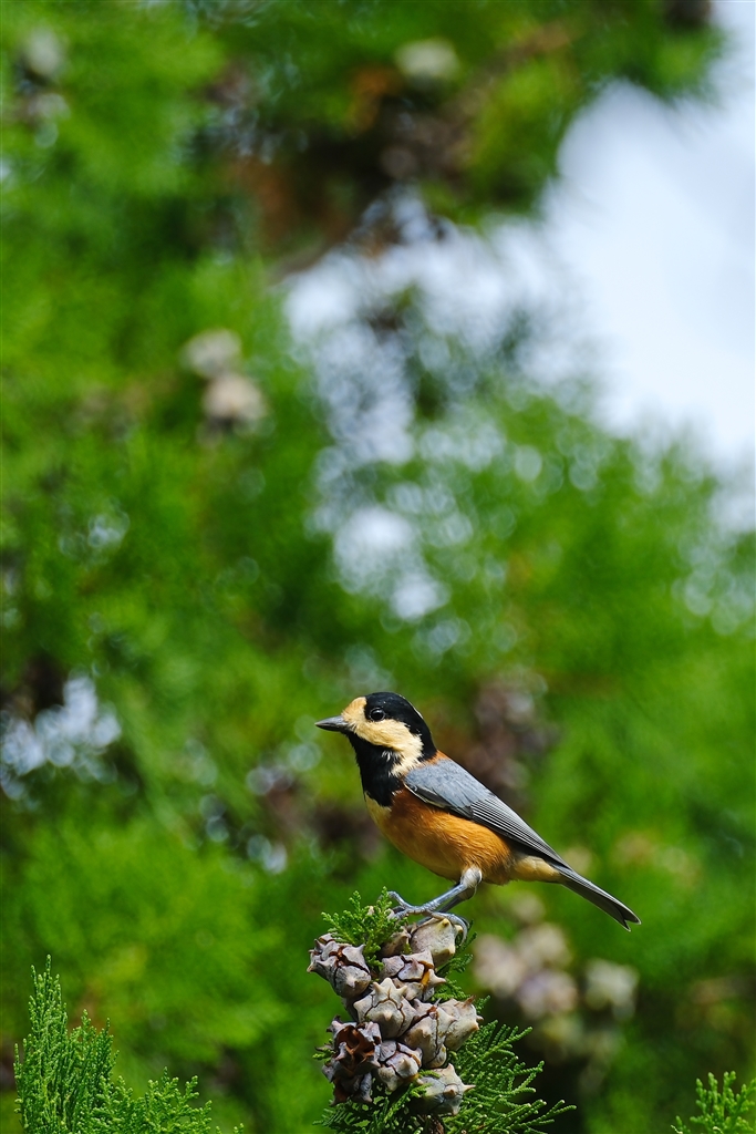 コノテガシワの球果をついばむヤマガラ