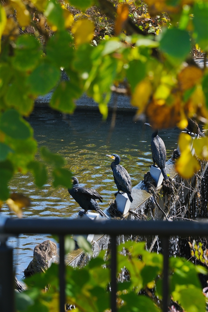 少し色づいた葉っぱを額縁に カワウ