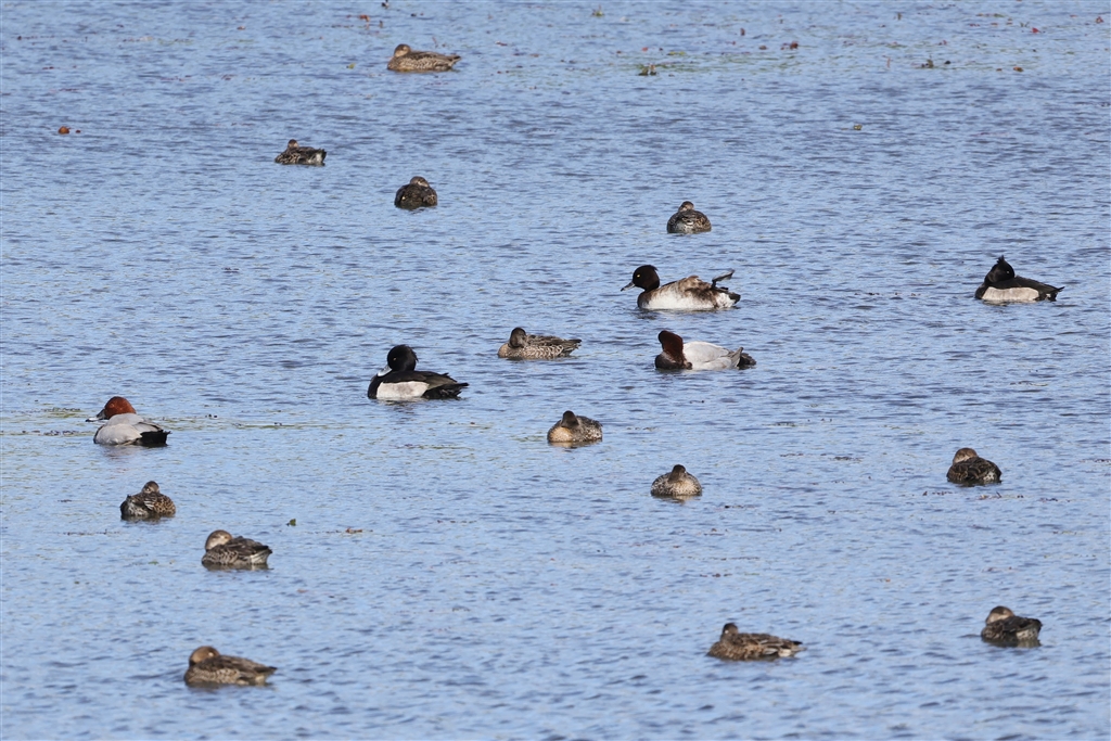 コガモに混じって、キンクロハジロとホシハジロ