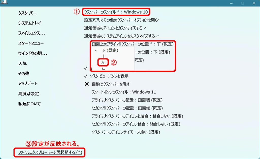 タスクバーのスタイル>Windows11