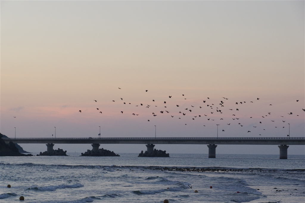 カラスの群れが島に寝に帰る所