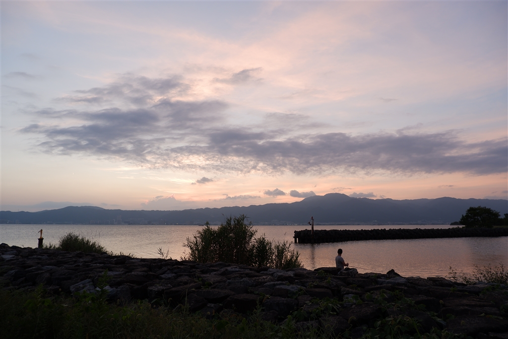 草津市の琵琶湖岸から望む夕景…夕日は雲の中でした。