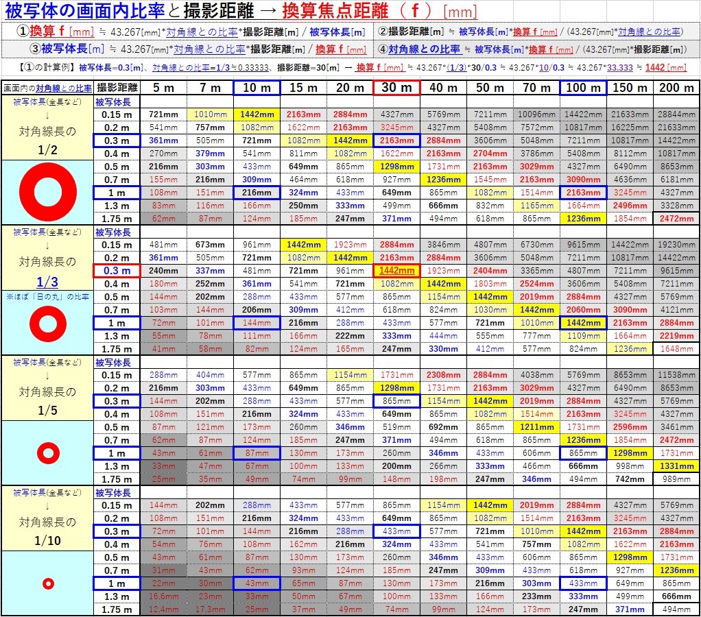 『【小鳥~人間サイズ用】画面内の被写体の大きさ(比率)と撮影距離⇒換算f』 レンズすべて ありがとう、世界さんのクチコミ掲示板画像1/2