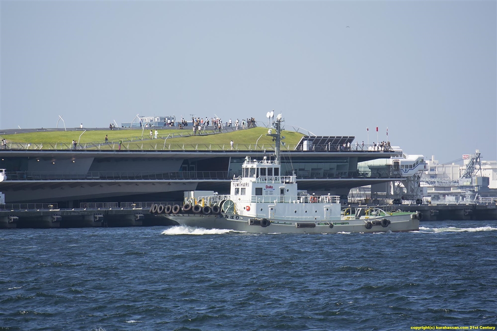 船の向こうの緑の山が、大桟橋の『くじらのせなか』