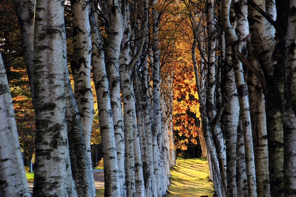 岩手県県民の森では白樺並木の先に日が射していました