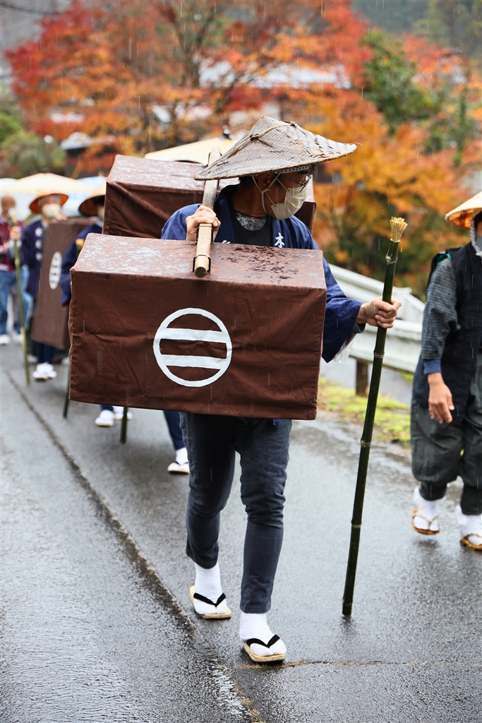 行列には駕籠かき・飛脚・武士・浪人・鳥追い女・虚無僧など様々な人が加わる