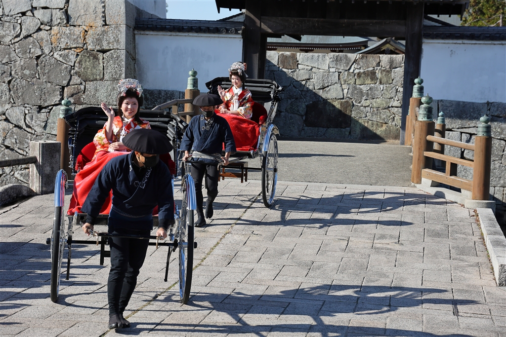 義士娘たちが人力車に乗って赤穂城跡の大手門を出る