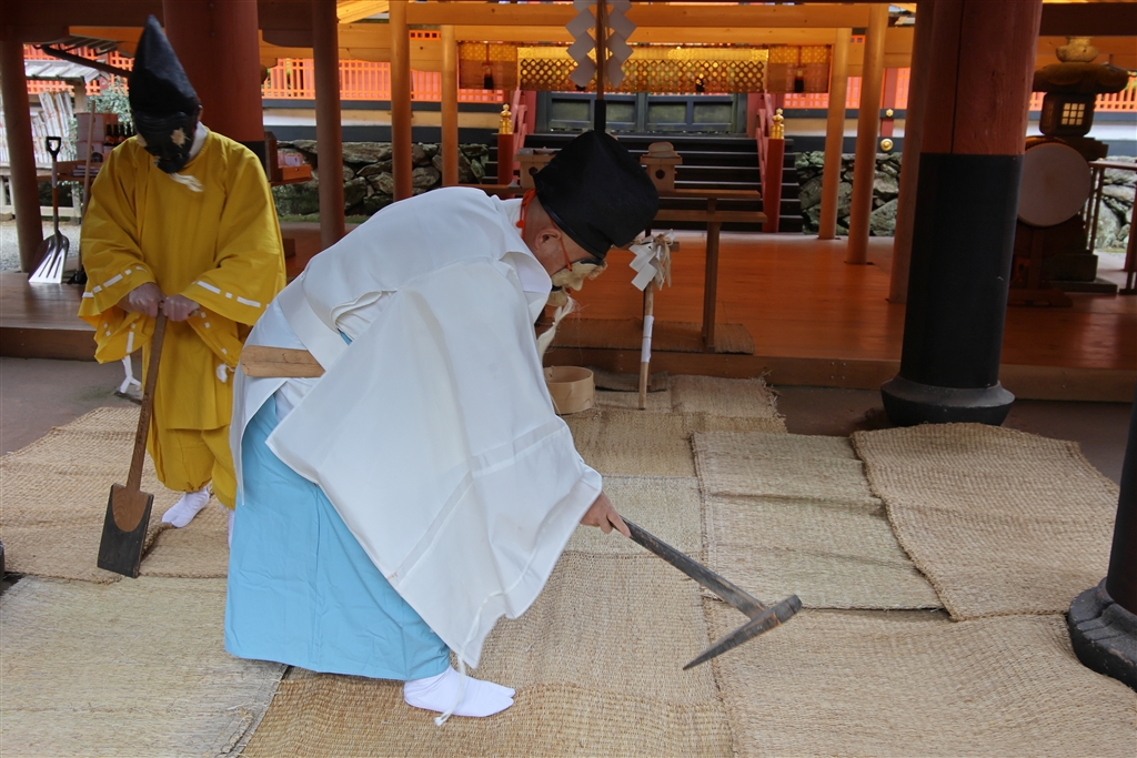 田人と牛飼いが農作業をする