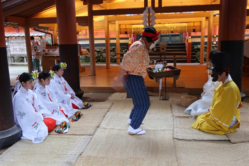 モンペ姿で女装したひょっとこ面(田ヅ女)が滑稽な仕草をする