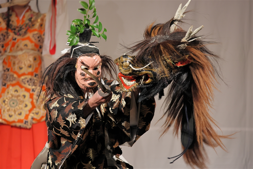 須佐之男命が毒の酒を飲んで寝た大蛇を退治する