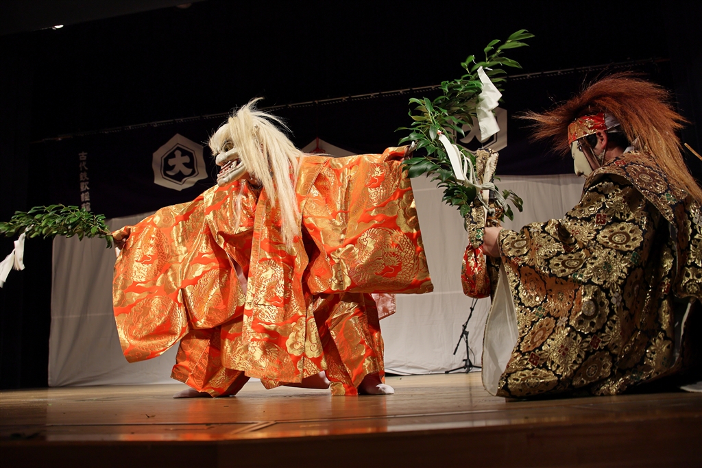 葦原の奥に誘い込まれた日本武尊は炎色の衣装を着た案内役の賊に火を放たれる