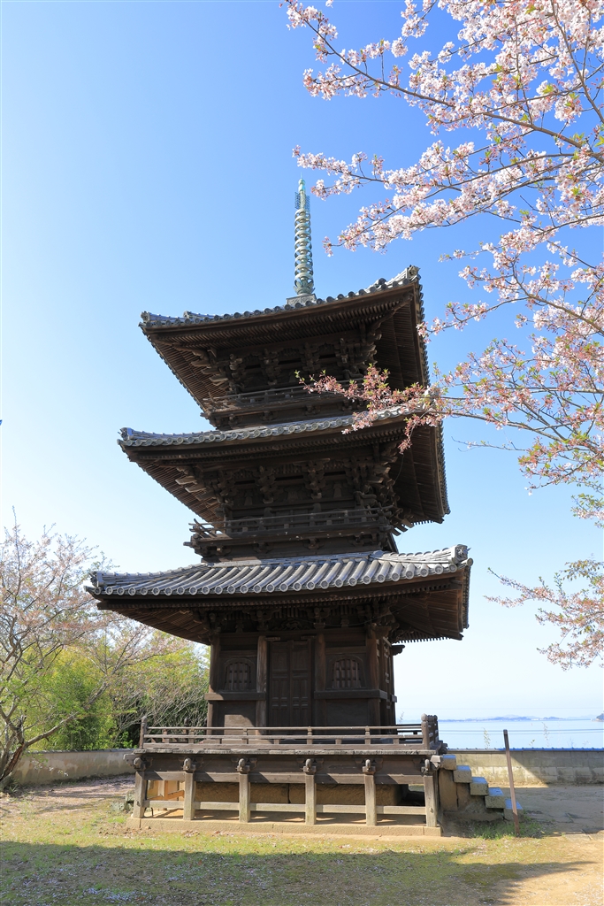 本蓮寺三重塔、葉桜ですが遠目ではまだ綺麗です