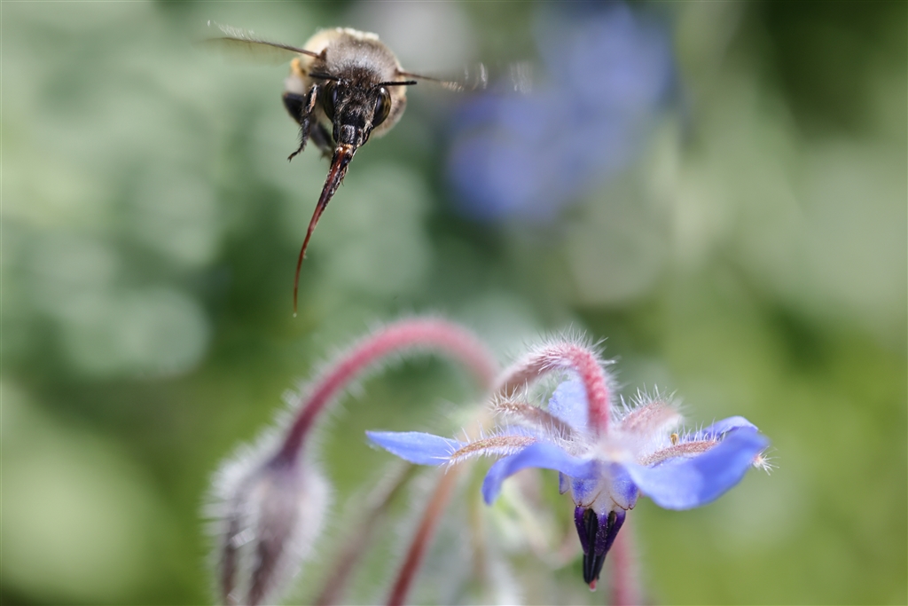 ストローを伸ばして吸蜜体勢に入っているマルハナバチ
