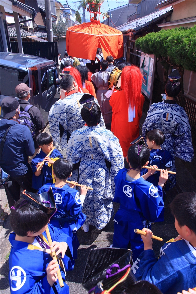 やすらい祭(今宮神社)で花傘や赤毛・黒毛の鬼たちの行列が街を練り歩く