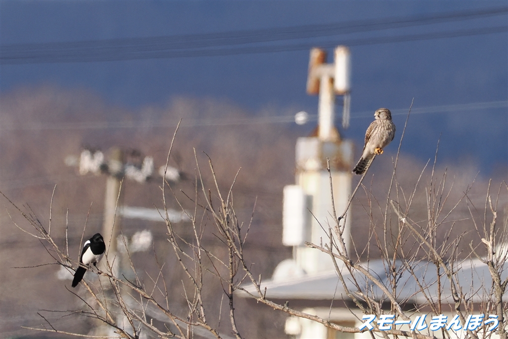 初見初撮りのチョウゲンボウ、そばにカササギ