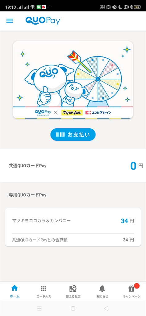 QUOカードPay残高34円