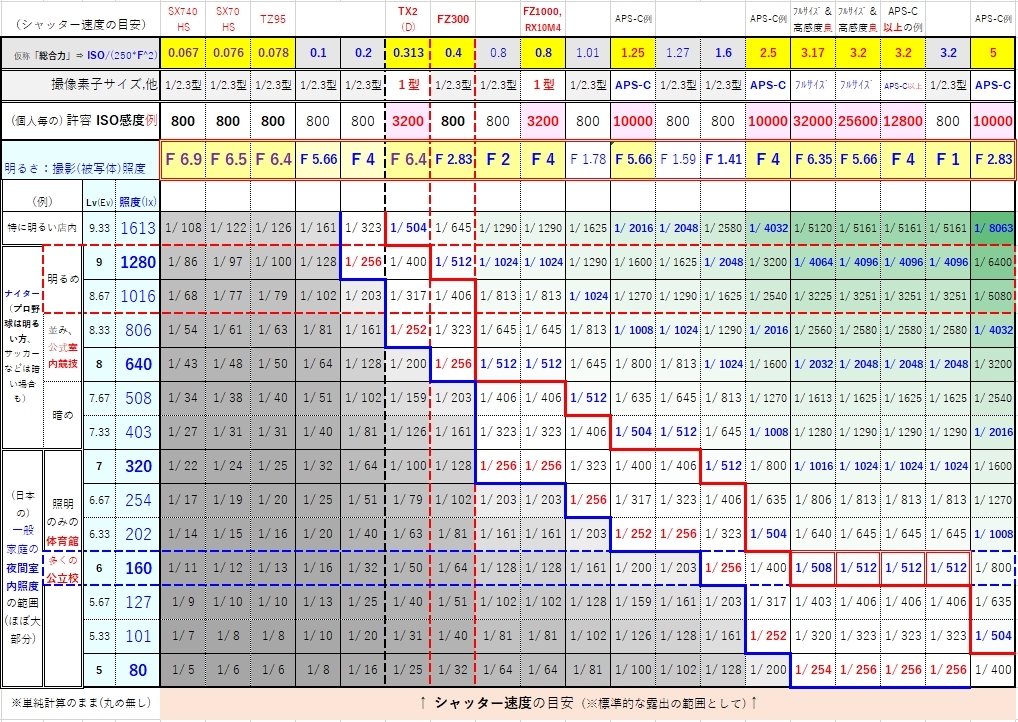 ナイター照明他の条件と仕様別のシャッター速度例
