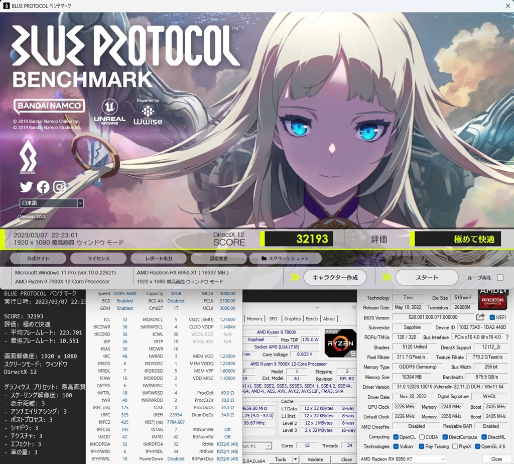 BlueProtocol 7900X + 6950XT-Pure DDR5-6000CL32(tRFC 525) with Wraith Prism