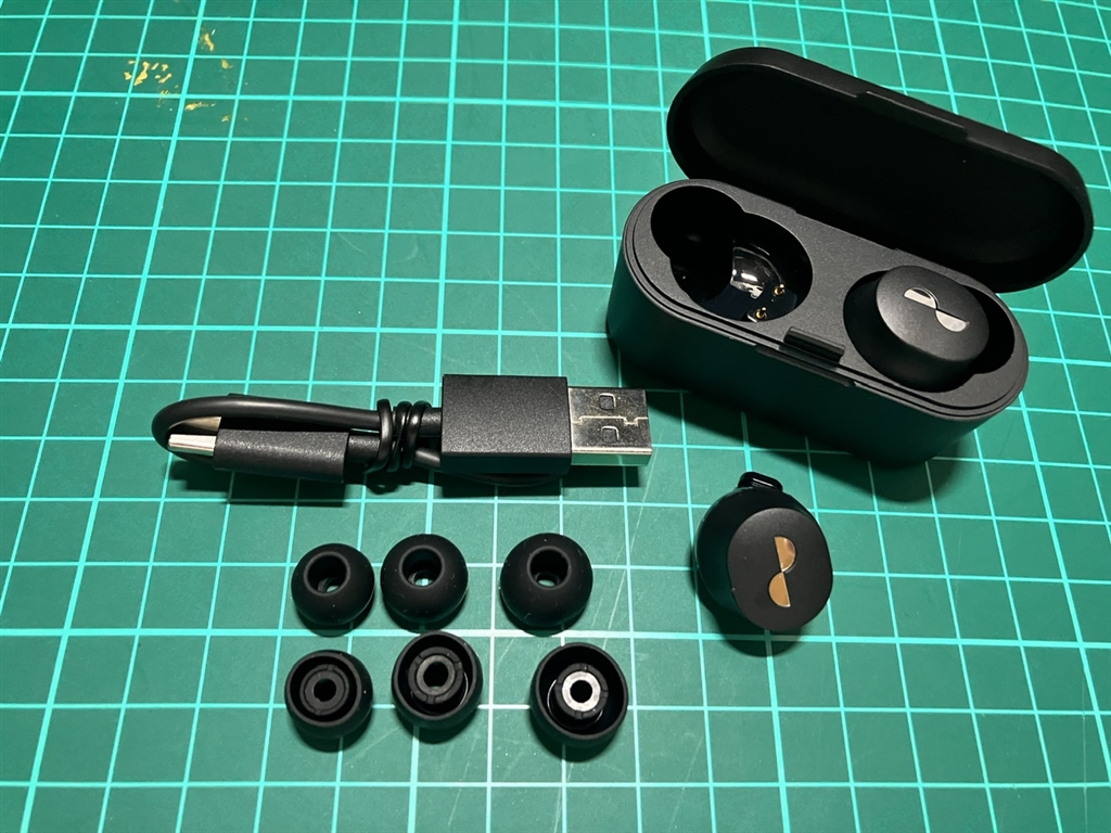 中身。充電ケース、本体、イヤーチップ、ケーブルです。