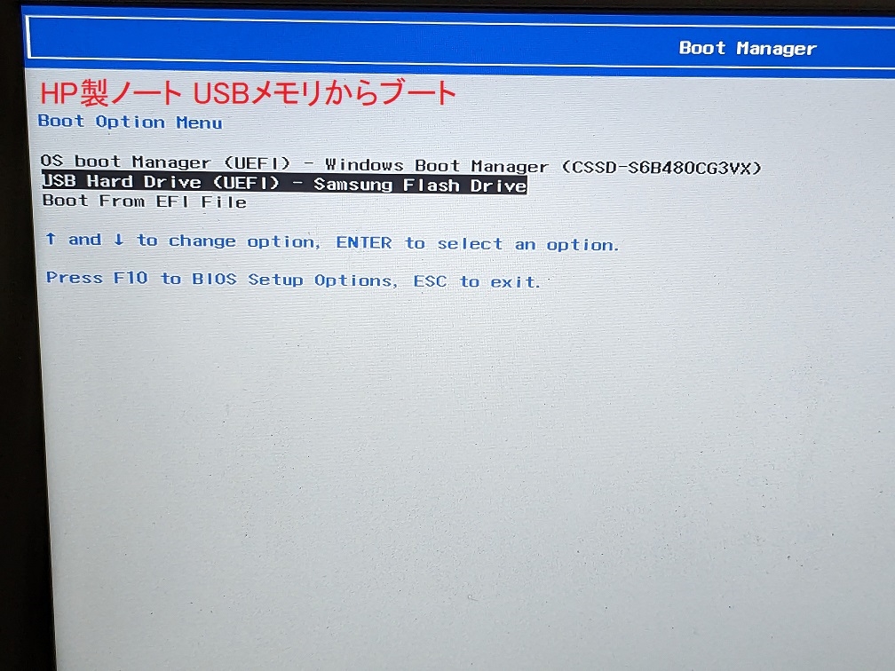 AHP製ノート ブートデバイス選択メニュー画面
