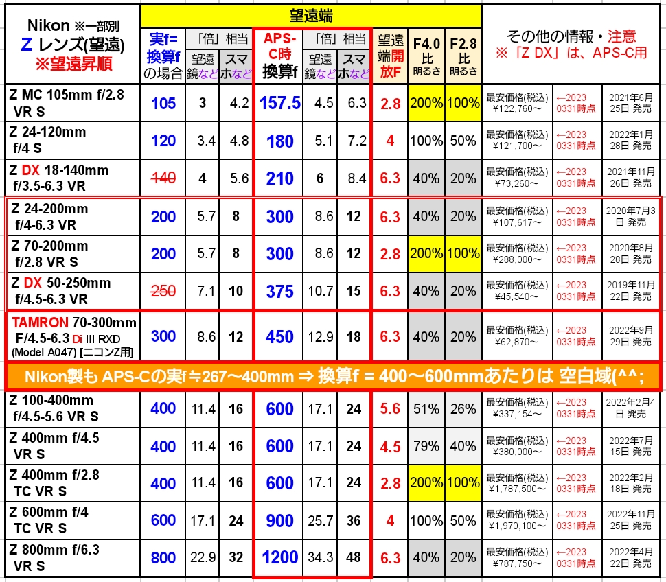 Z レンズ 100mm以上 ※230331現在