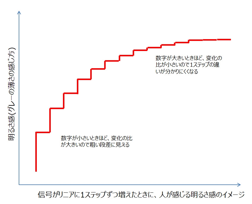 リニアに1ステップずつ変化した場合の明るさの感じ方