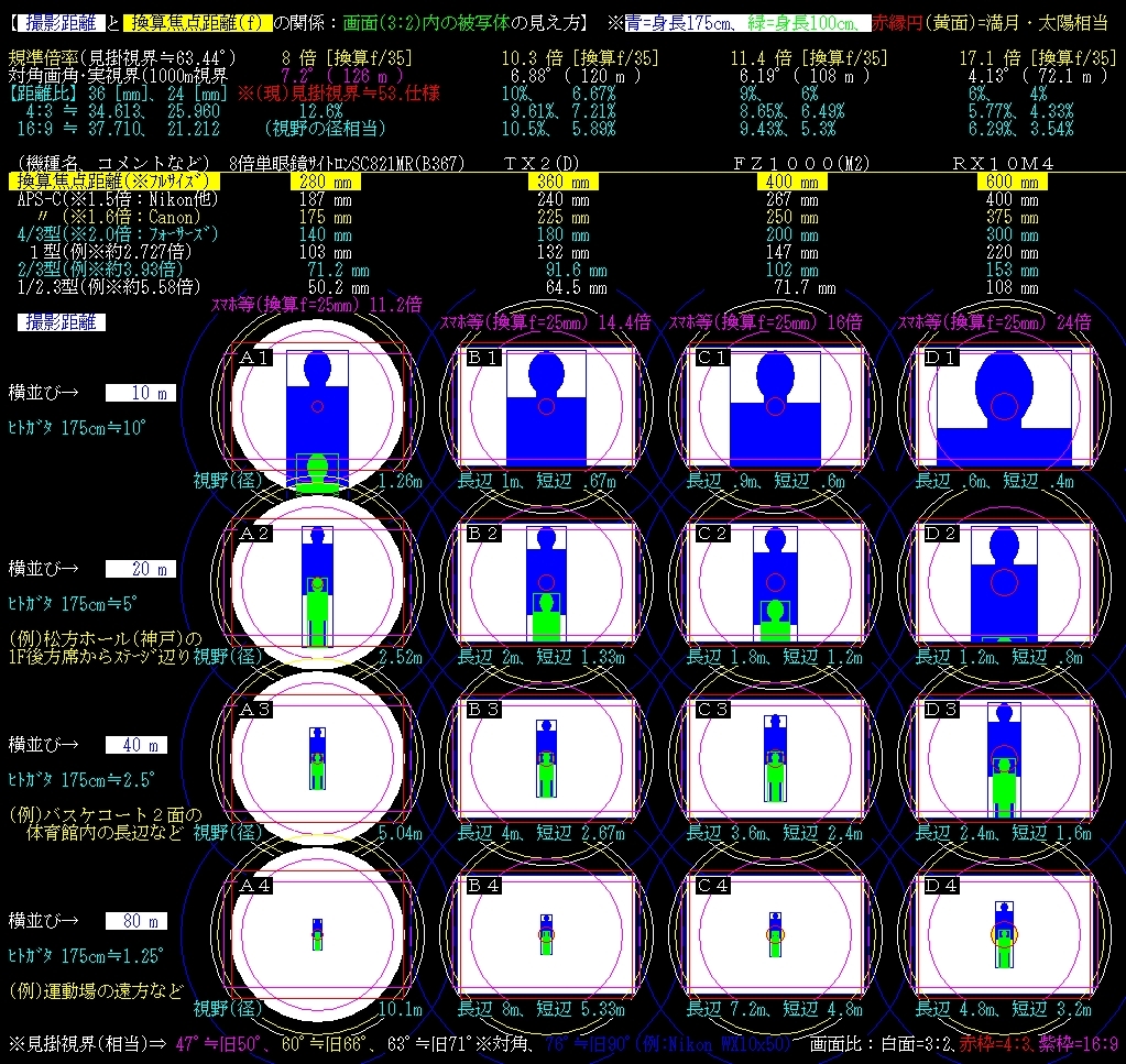 【】8倍単眼鏡、換算f⇒【B】360、【C】400、【D】600mm、距離10~80m