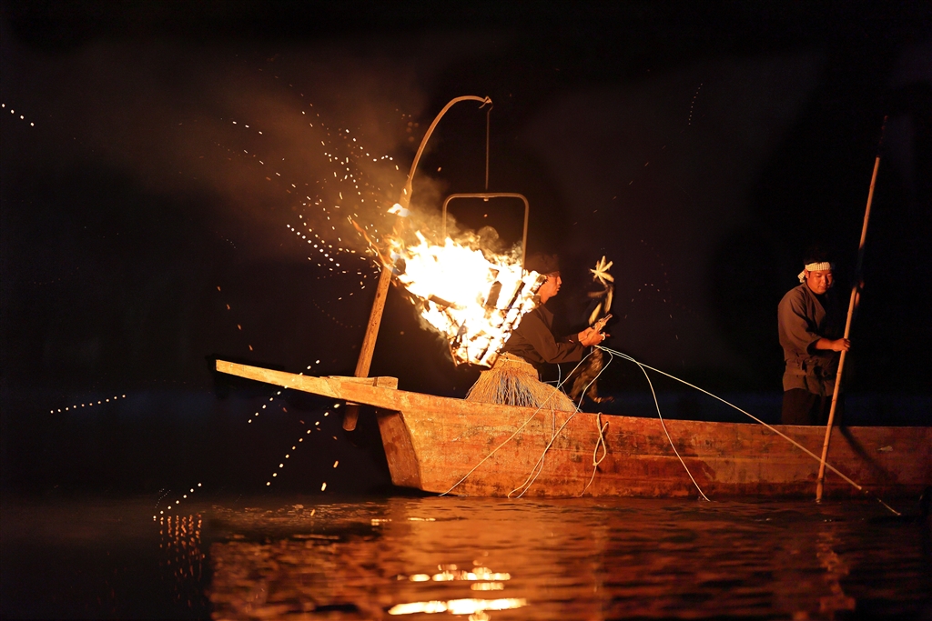 吐き出したアユは空中で1回転する(10枚をコンポジット…火の粉も点々になった)