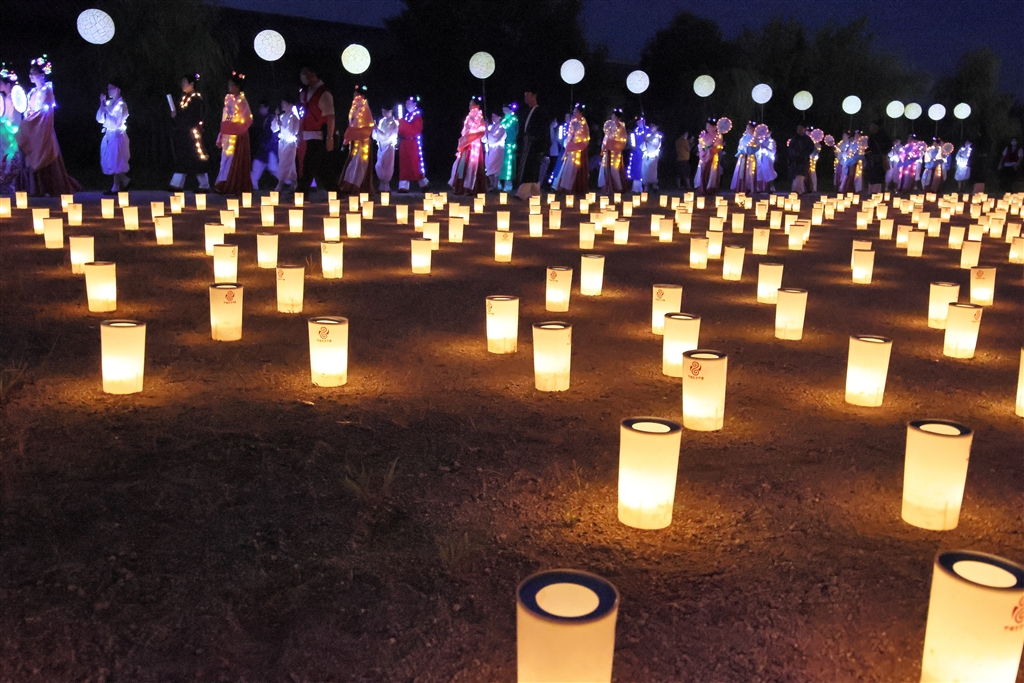 ロウソク畑のような多数の灯りの向こうを天平七夕行列が歩く