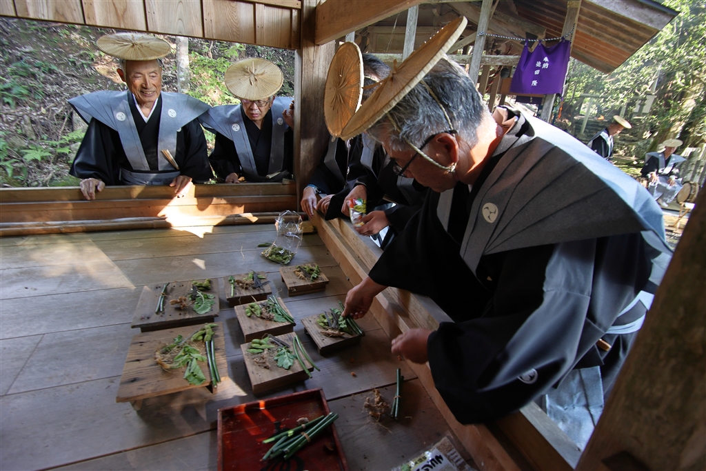 宮座たちが七つのお供え物を丁寧に供える