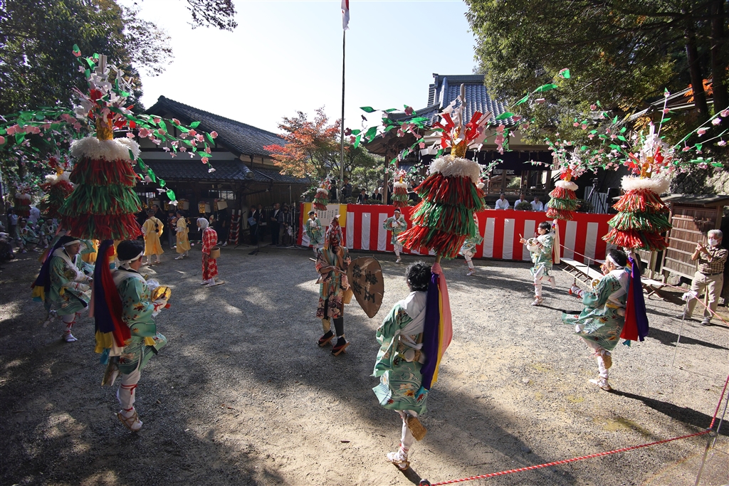 円陣を組んで上端にゴヘイと枝垂れ花をさしたシナイを背負った青年が愛宕踊りをする
