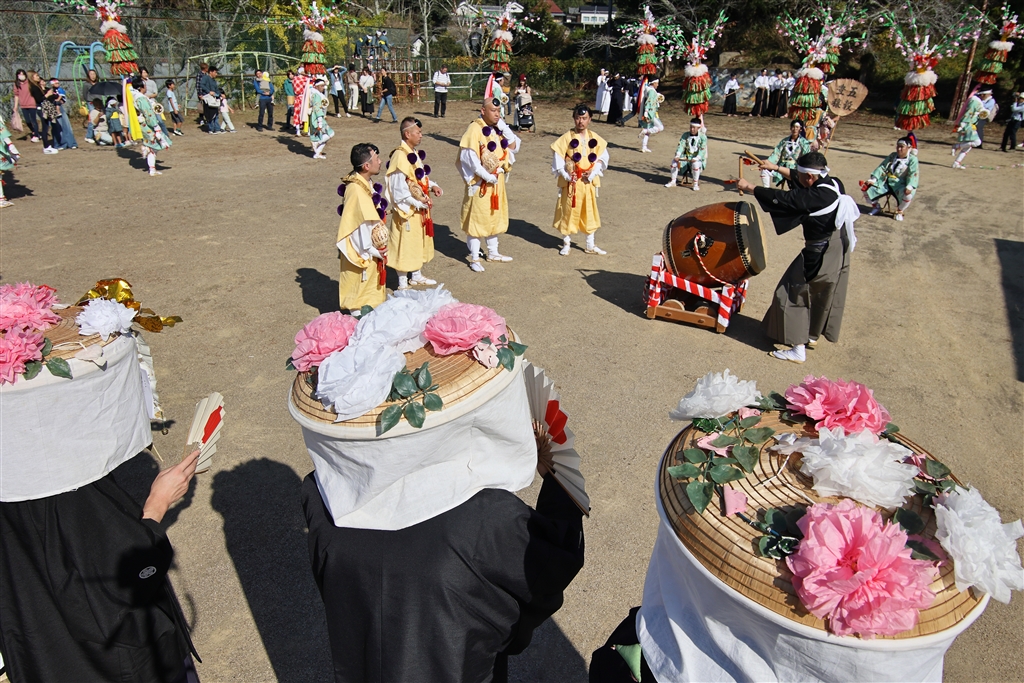金のマスクで顔を隠し花飾りを載せた羽織袴の男衆の上から踊りを撮影