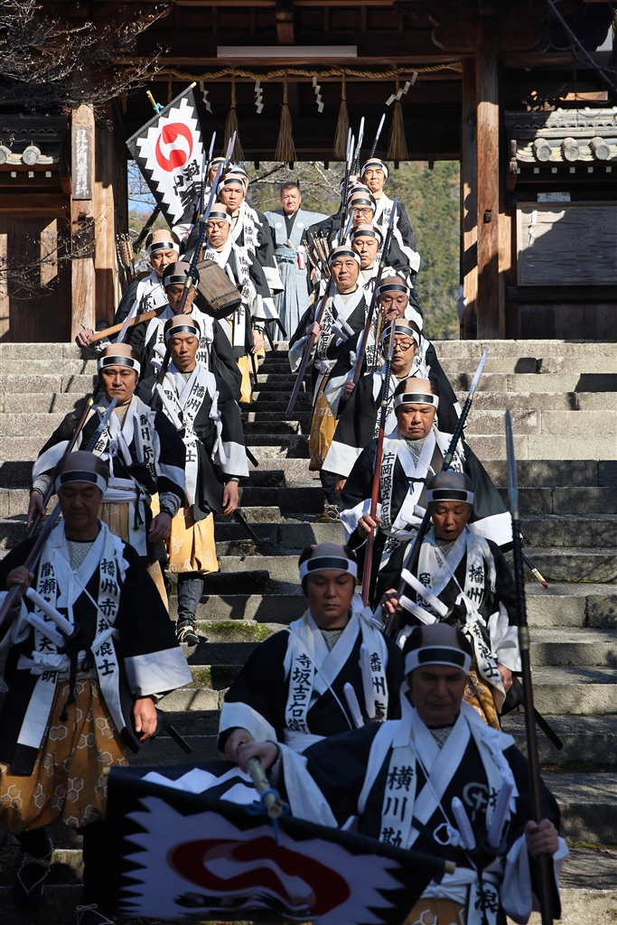 大石内蔵助と四十七士が毘沙門堂の山門を出る