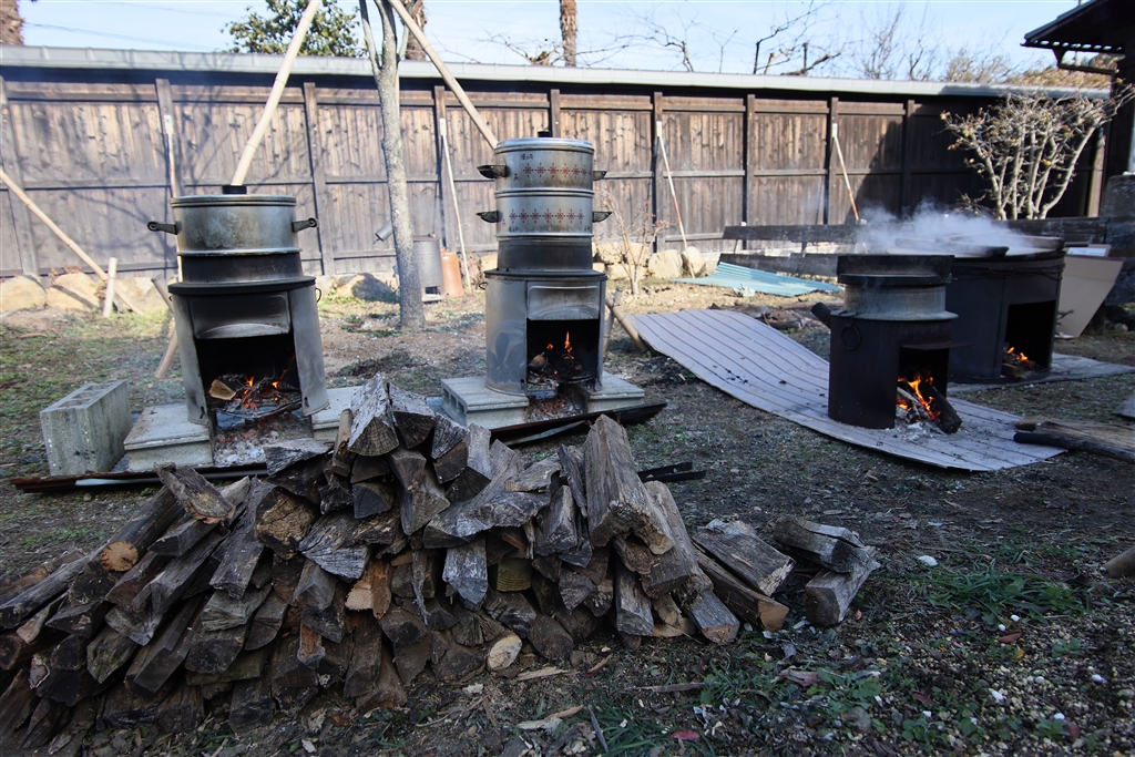 もち米を蒸篭(せいろ)で蒸す