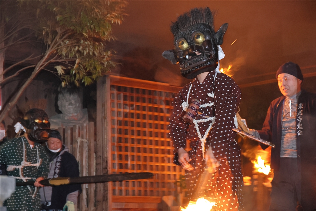 手前が松明を持った赤鬼、左後ろにいるのが鉾を持った青鬼