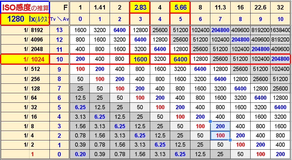 Lv(Ev)9 ⇒ 撮影(被写体)照度1280 lx(ルクス)で、シャッター速度1/1000秒の例