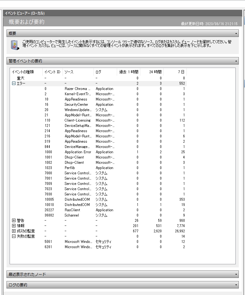 イベントビューアのエラー一覧