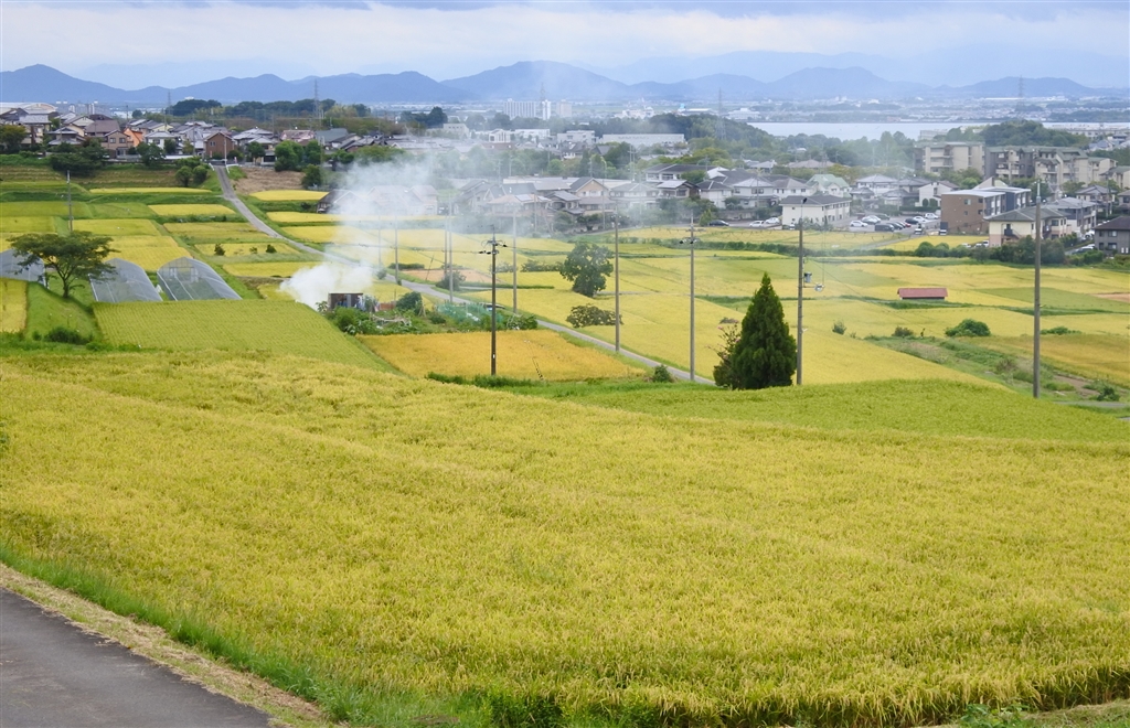 その坂から見た、刈り取り前の田