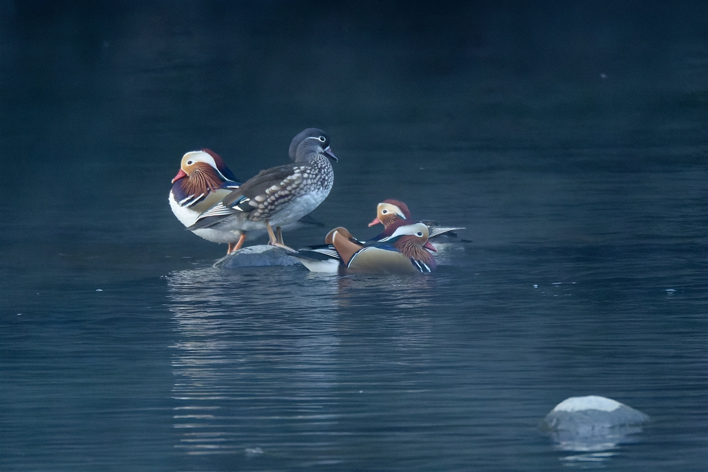 早朝の渓谷のオシドリたち−3