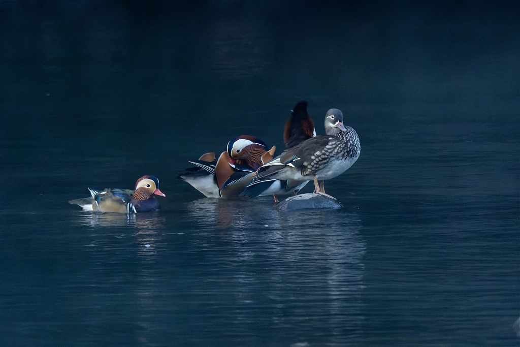 早朝の渓谷のオシドリたち−4