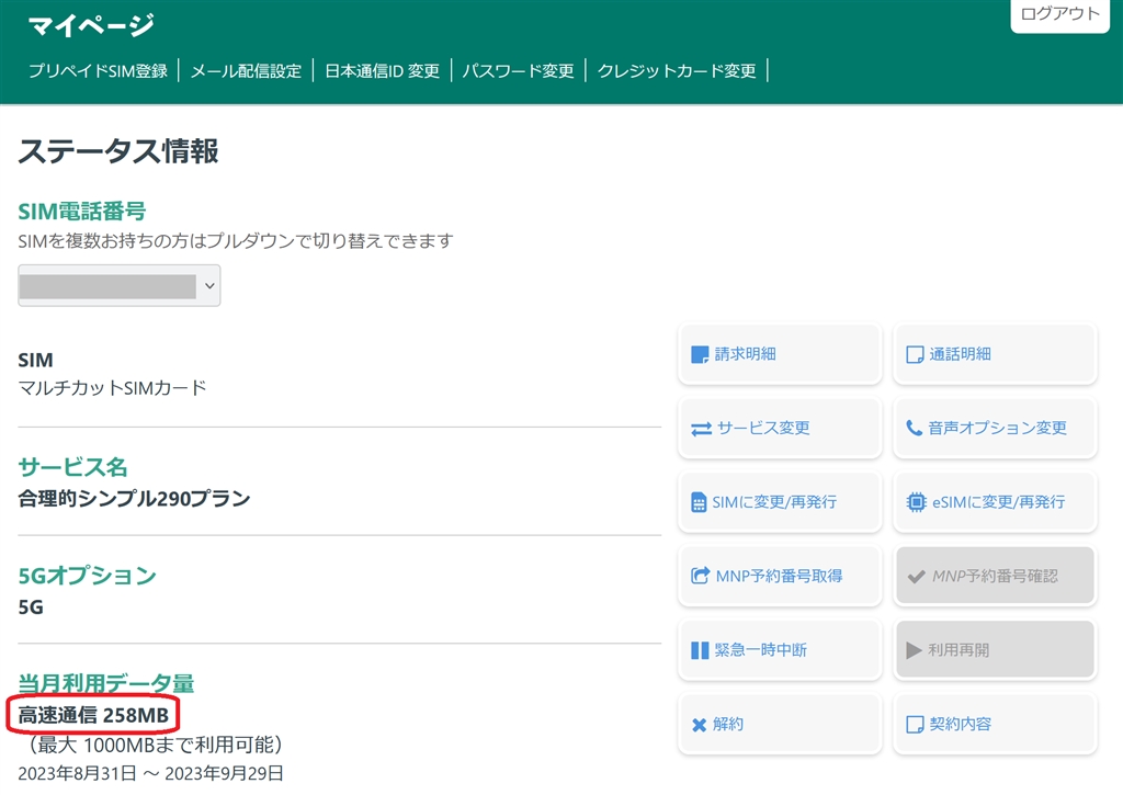 日本通信のデータ消費量は258MB