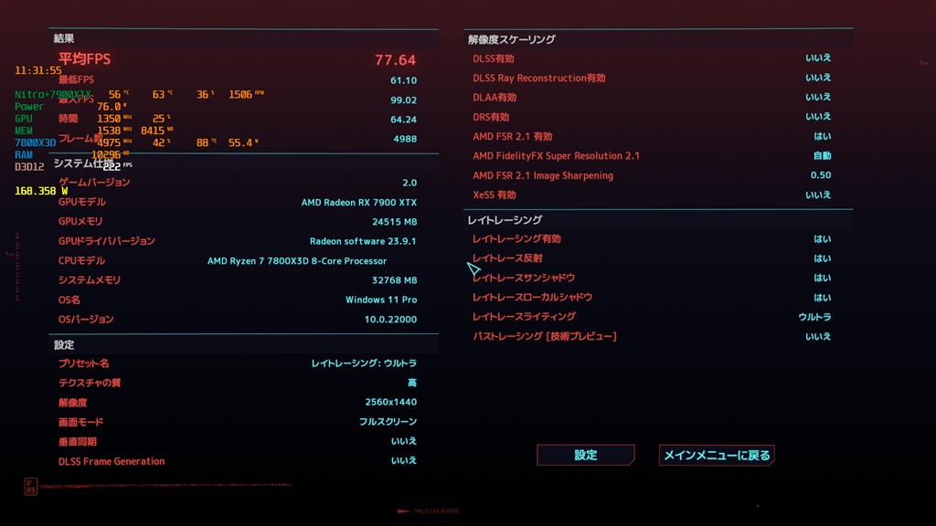 Cyberpunk2077 7800X3D + Nitro+7900XTX SMT 自動