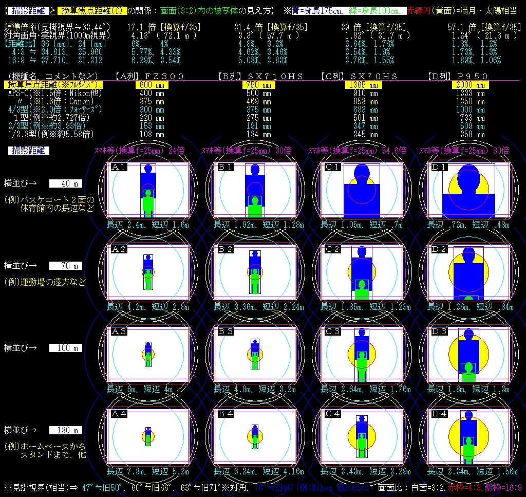 撮影距離 40m~130mのみ、【A列】FZ300、【B列】SX710HS、【C列】SX70HS、【D列】P950