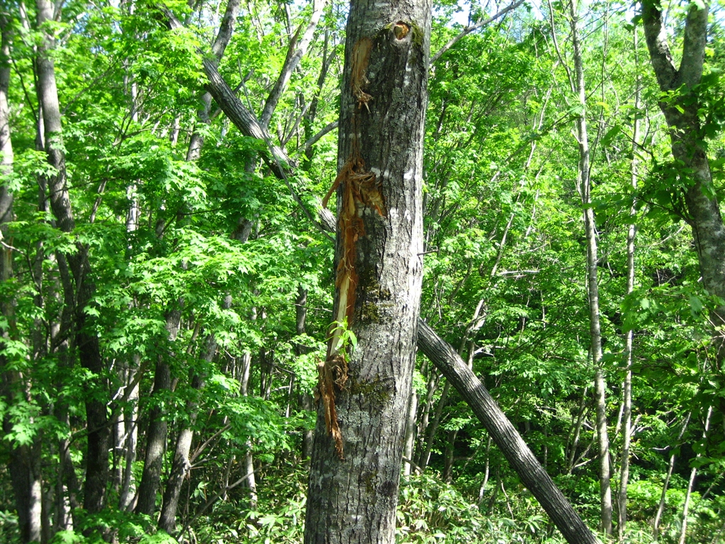 尻別川沿いの雑木林で、この木だけ皮がはがされてました。